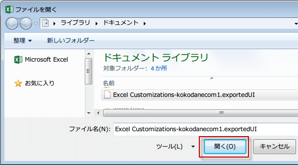 エクセルカスタミゼーションファイルを選択して開くボタンをクリック。