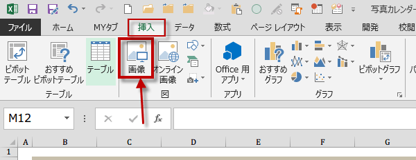 挿入タブの画像をクリックして、パソコンに保存してある画像を取り込みます。(画像は予め決めておきましょう。)
