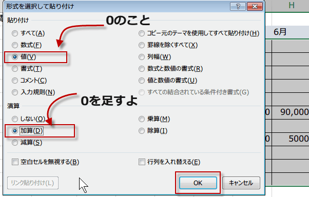 貼り付けるものは、値、そして、演算で加算にチェックを入れます。