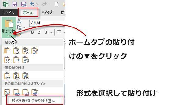 あるいは、ホームタブの貼り付けの▼をクリックして、形式を選択して貼り付けをクリックします。