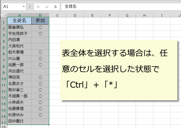 表全体を選択する場合は、任意のセルを選択した状態で「Ctrl」+「*」