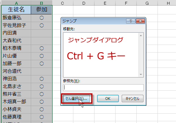 ジャンプダイアログを表示するショートカットキー「Ctrl + G キー 」または、F5キーを押します。