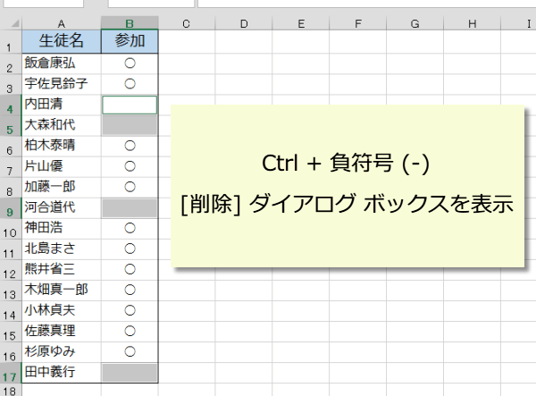 Ctrl + 負符号 (-)で 削除 ダイアログ ボックスを表示