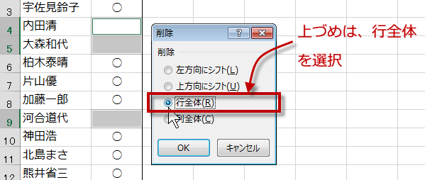 削除ダイアログボックスで、上づめは、行全体を選択します。