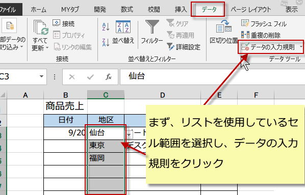 まず、リストを使用しているセル範囲を選択し、データタブをクリックし、[データツール] の [データの入力規則] をクリックします。