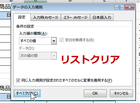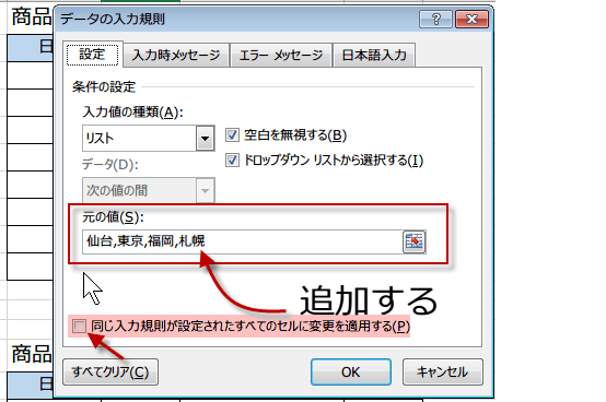 同じ入力規則が設定されたすべたのセルに変更を適用するにチェックをいれてください。