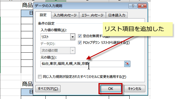 データの入力規則ダイアログボックスが表示されたら、設定タブタブの元の値の欄に入力されているリストの後ろに、追加項目を入力します。