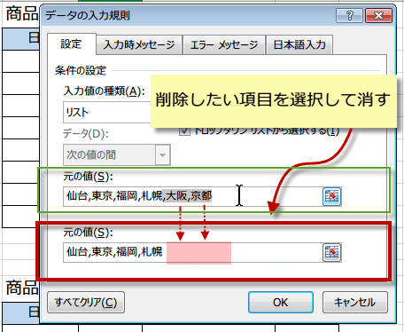 1.シート上にリストを作らず、データの入力規制で直接リストを作成した場合のリスト項目の追加と削除、リスト自体の削除方法。