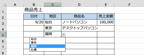 以下の表には、地区名として4つの地区をドロップダウンリストにしています。