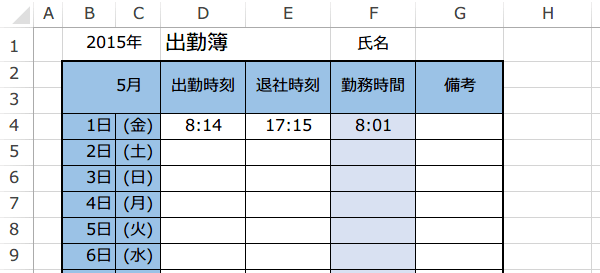出勤時刻と退社時刻の入力に制限がないので、勤務時間に端数が出てしまっています。
