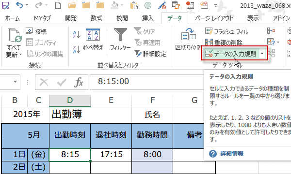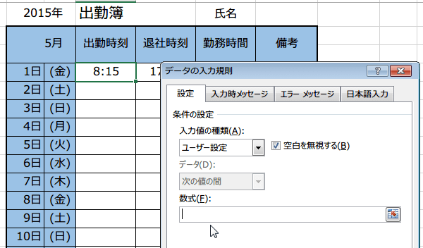 15分単位の時刻だけを入力できるようする入力規制〜Excel 2013