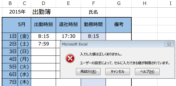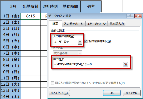 これで、余りが0でなければ入力できなくなります。つまり、15の倍数しか入力できません。D5セルを出勤と退社時刻の欄にコピーします。