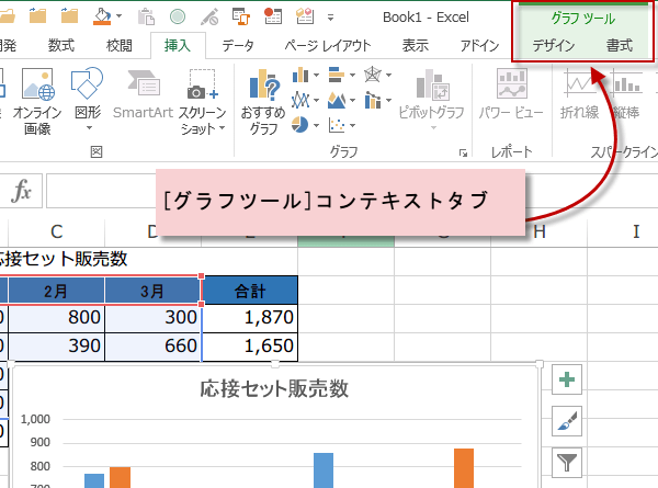 グラフをクリックすると、リボンには[グラフツール]コンテキストタブが表示されます。