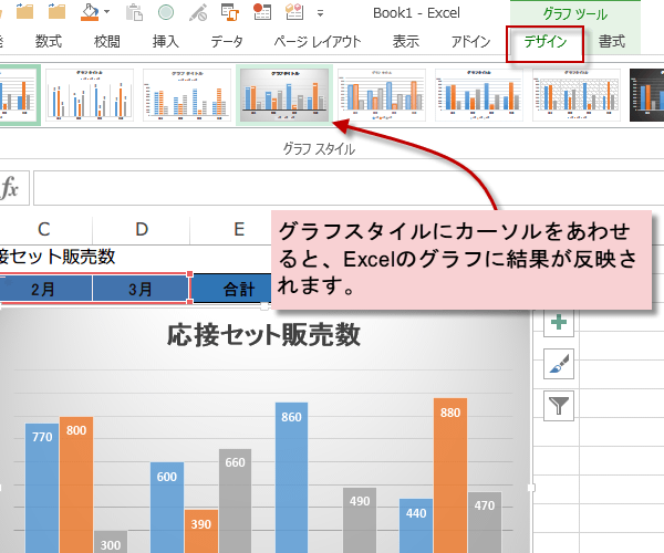 デザインタブをクリックするとスタイルの一覧が表示され、スタイルにカーソルをあわせると結果がExcelのグラフに反映されます。