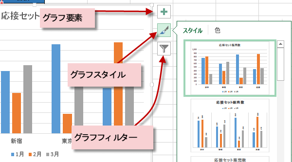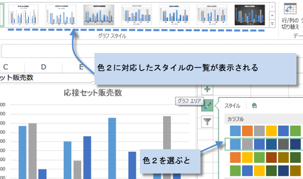 色2を選んでみました。色2に変更すると、グラフスタイルが色2に対応して表示されますので、その中から色2に対応したスタイルに変更することもできます。