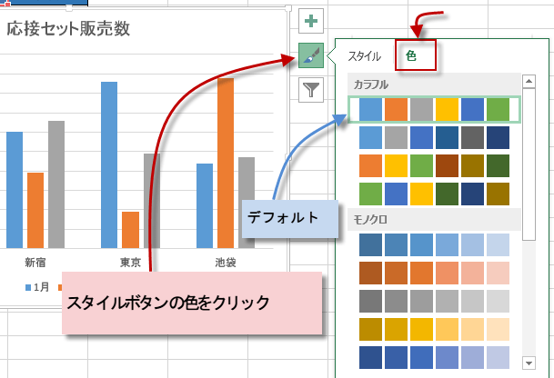 このボタンのグラフスタイルボタンから色を変更することができます。