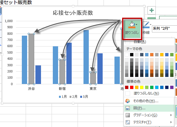 変更したいグラフ凡例(例ではグレーの縦棒)を選択し、右クリックでメニューを表示して、塗りつぶしを選択します。このように直接的な変更もできます。