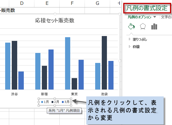 グラフの凡例の色を一つずつ変更する・・凡例の書式設定から