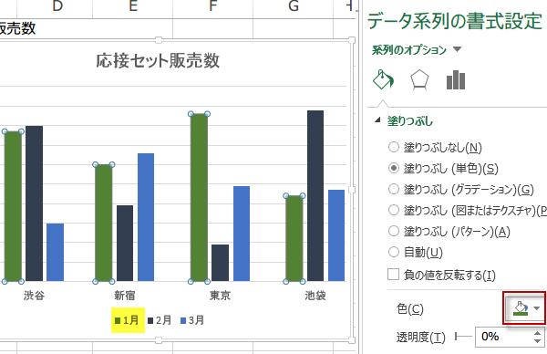 今度は1月だけ凡例の色を変更します。このように凡例の色の変更もまとめて変更したり、一つずつ変更したりと好きな方法を選ぶことができます。
