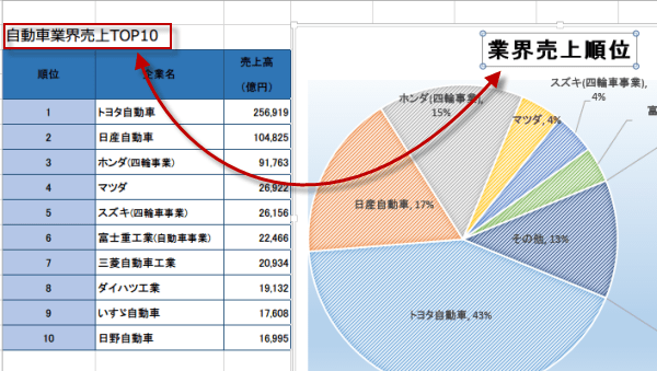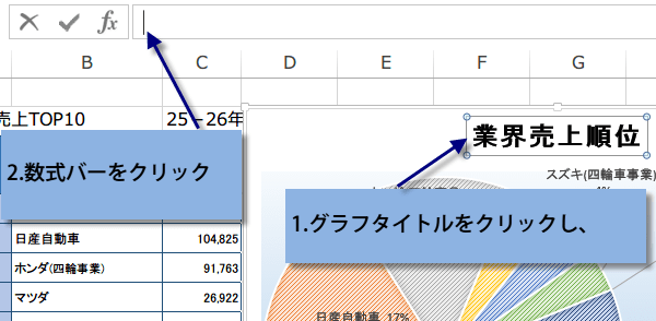 グラフタイトルは、直接入力してもいいのですが、あとでタイトルが変更になる可能性もある場合などは、セルの内容をタイトルにしておいたほうが便利です。