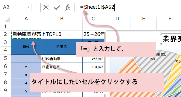 「=」と入力したら、グラフタイトルに使いたいセルをクリックします。