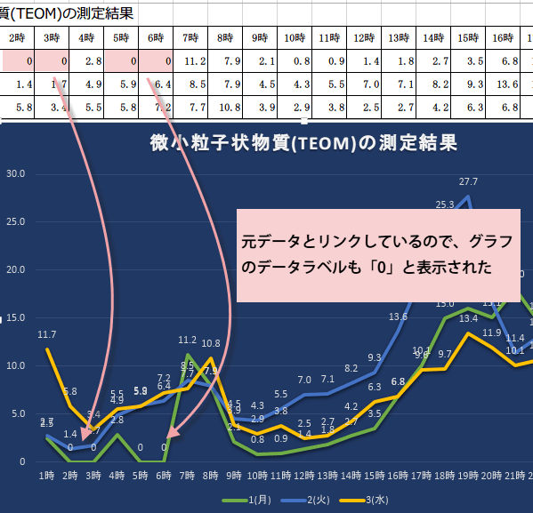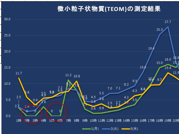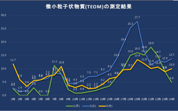 下図は微小粒子状物質の測定結果を表した折れ線グラフす。