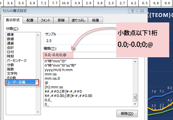 セルの書式設定ダイアログが表示されるので、ユーザー定義を選択し、種類にの欄に「0.0;-0.0;0;@」と入力します。