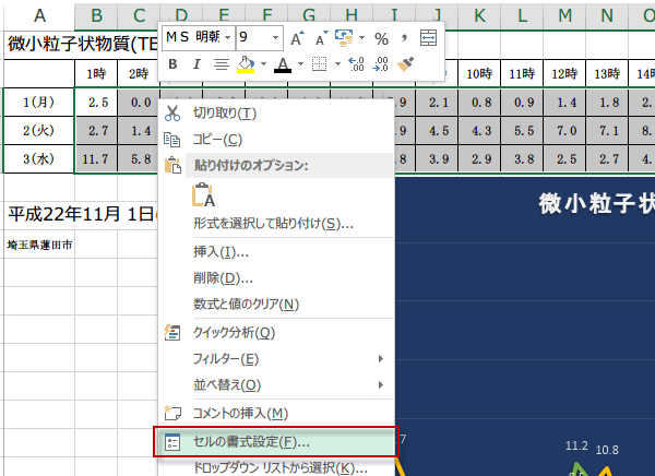 表のデータ範囲を選択して右クリックからセルの書式設定をクリックします。