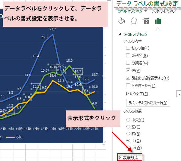 データラベルをクリックして、データラベルの書式設定を表示させます。下方にある表示形式をクリックします。