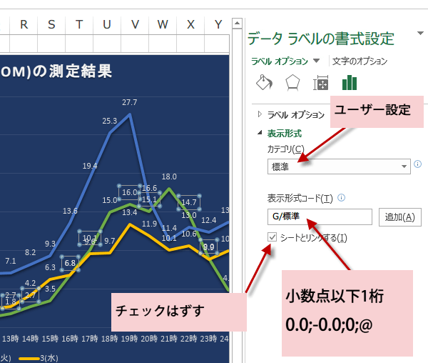 元表はそのまま「0.0」と表示され、グラフのデータラベルのみ「0」と表示されるように設定できました。