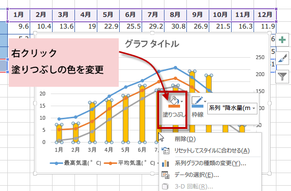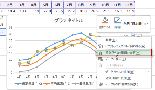 降水量を縦棒グラフに変更することにします。 降水量を選択して右クリック。