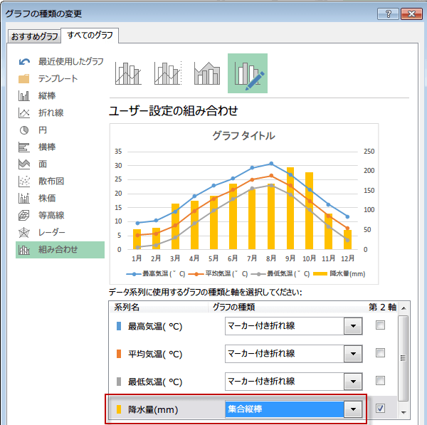 グラフの種類の変更ダイアログが表示されたら、変更したい系列名「降水量」の欄のグラフの種類を集合縦棒に変更します。