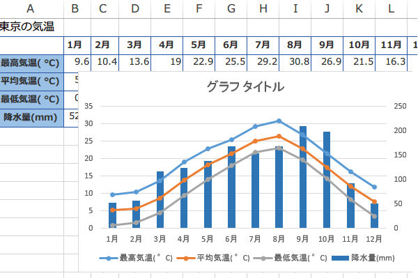 今回は、種類の違うグラフを同じグラフ上に表示することで、系列をはっきりと見分けることができるようになります。