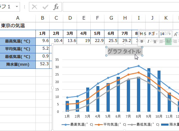 系列「降水量」が集合縦棒のグラフに変わりました。これで、かなり見やすくなりましたね。さらに色を変えてみましょう。系列をクリックして塗りつぶしの色を変更します。