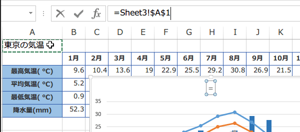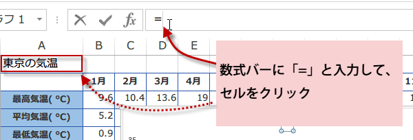 グラフタイトルを選択して反転させ、数式バーに「=」と入力します。