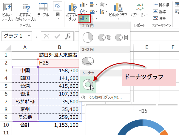 データを選択して、挿入タブのグラフから円グラフを選択して、ドーナツを選びます。