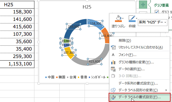 グラフ右上に表示される要素ボタンをクリックして、データラベルにチェックを入れます。今度はデータラベルを右クリックして、データラベルの書式設定をクリックします。