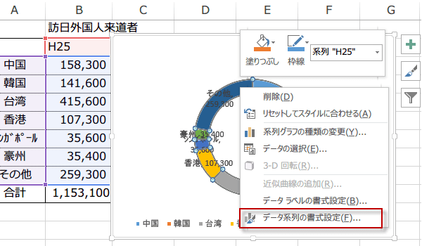 ドーナツグラフの穴の大きさを変えるには、まず、データ系列部分つまりドーナツ部分を右クリックします。