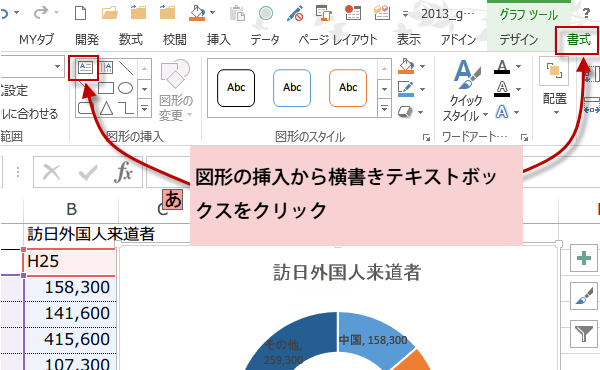 ドーナツの穴に文字列を表示するには、グラフを選択して、グラフツールタブの書式をクリックします。図形の挿入から横書きテキストボックスをクリックして挿入します。