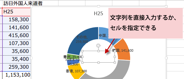 ドーナツグラフの穴の部分に合計などを表示するには
