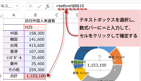 グラフ中のテキストボックスでは、セルの指定はできてもセルを結合する式を作成することができないので、合計1153100人のように表示したい場合は、直接入力します。