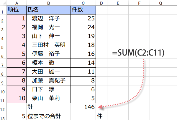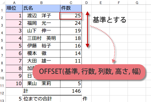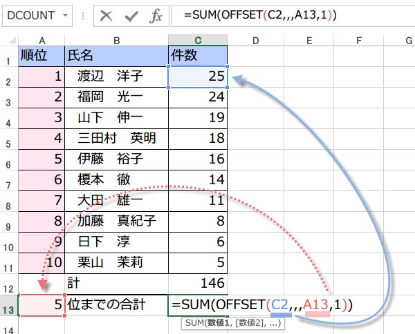 OFFSET関数を使って1位から5位まで5人分の件数を合計しましょう。