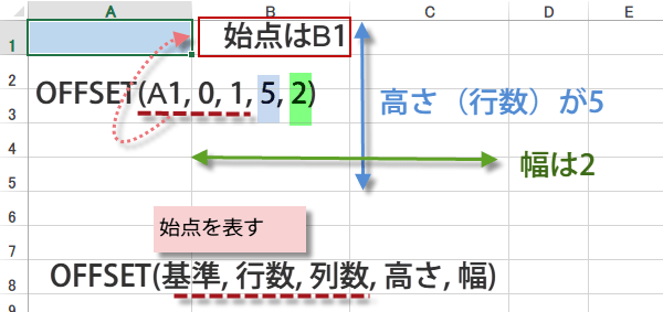 引数には「基点、移動行数、移動列数、高さ、幅」を指定します。