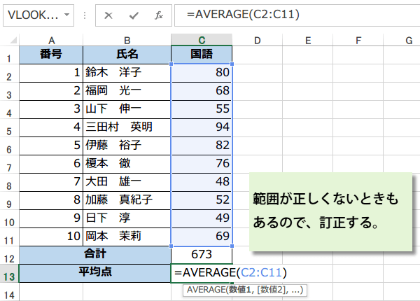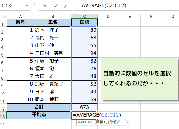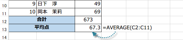 自動的に、平均するセルがブルーの枠線で囲まれ、数式バーや、C13のセルに