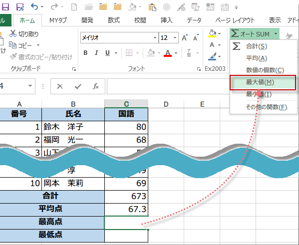 C14セルをクリック、Σマーク(オートSUM)ボタンの右にある▼から[最大値]をクリック(MAX関数が表示されます)
