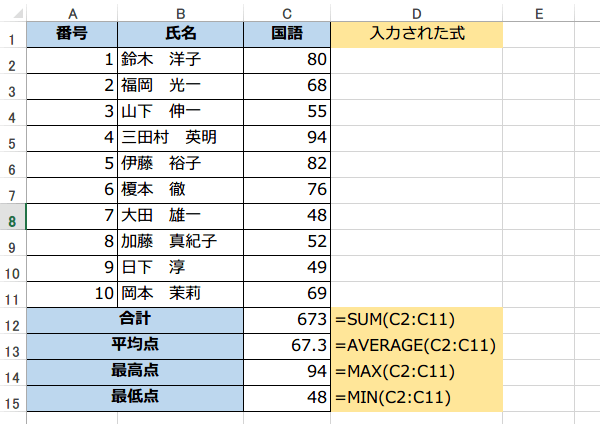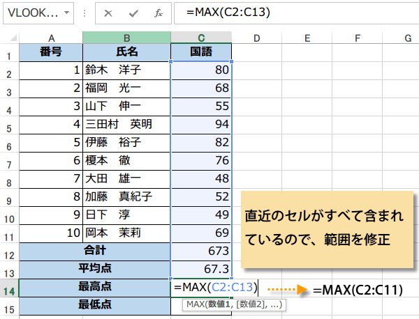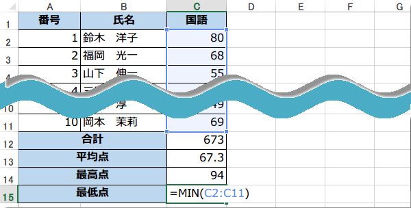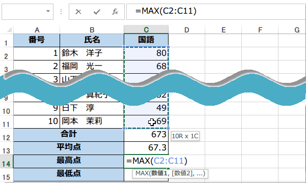 MAX関数、MIN関数の使い方 テストの点数の最高点、最低点を表示する