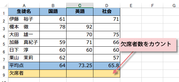 テストを欠席した者の点数は入力されていません。そこで表から空白セルをカウントして、欠席者数を出します。