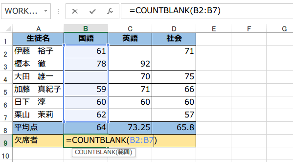 テストの成績表などで、空白のセルを数えて欠席者の人数を数えたい時には、COUNTBLANK関数を使います。