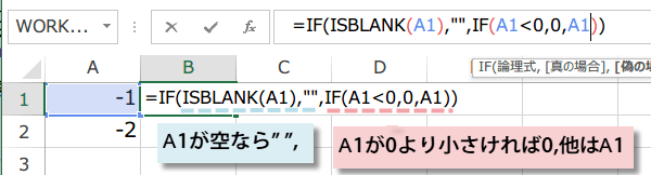 この式の場合は、空欄の場合はそのまま空欄で、マイナスの場合は0、それ以外はA1の数値をそのまま表示します。