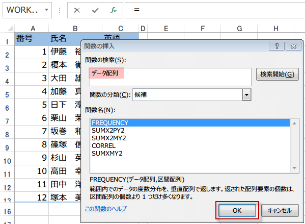 関数の挿入ダイアログからFREQUENCY関数を使う